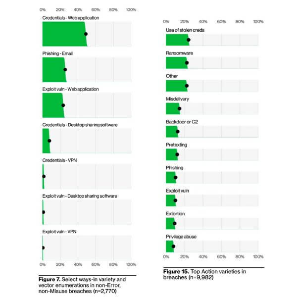 Looking at the left chart (Figure 15), we can see that hackers have a wide range of tools, and like to use all of them to some degree. This speaks to the fact that cyberattacks are not typically a single action- rather they are a whole ‘chain’ of actions linked together to gain access to a system- not just a single technique applied to a single attack surface, or vector. So in any given attack, many ‘actions’ will be used across multiple ‘vectors’- and we get a closer look at this connection in the above chart on the right (Figure 7). We can see that credentials used against a web application is far and away the most popular action/vector combo, and that threat actors will generally opt for credentials over exploiting software vulnerabilities: in each of the 3 vectors, web applications, desktop sharing software, and VPNs, the use of credentials is over twice the frequency of vulnerability exploitation.